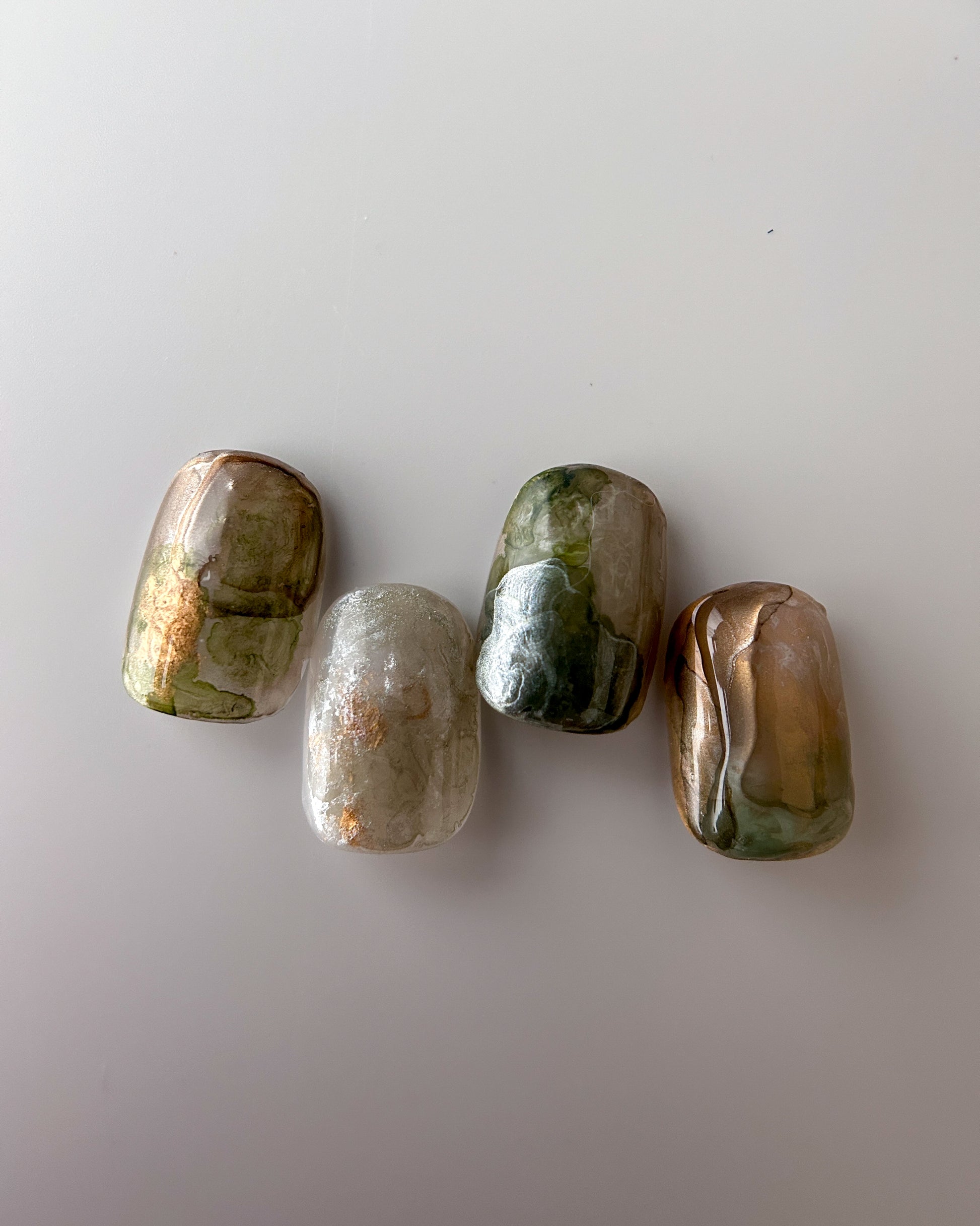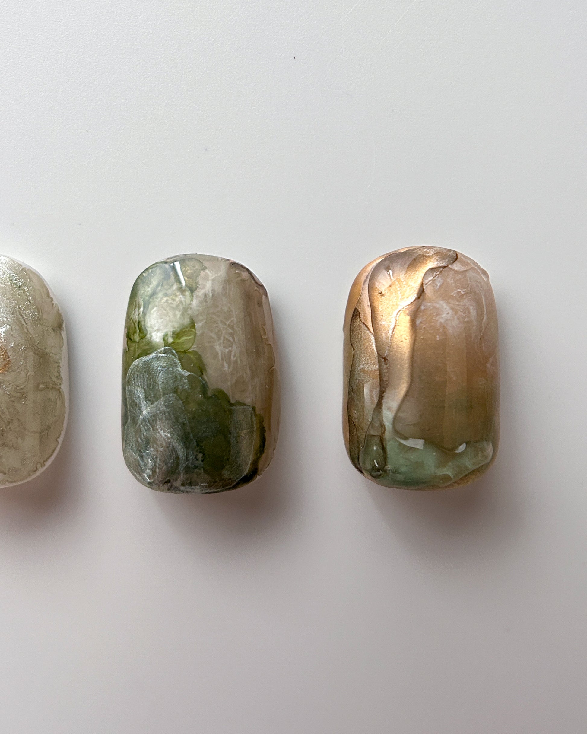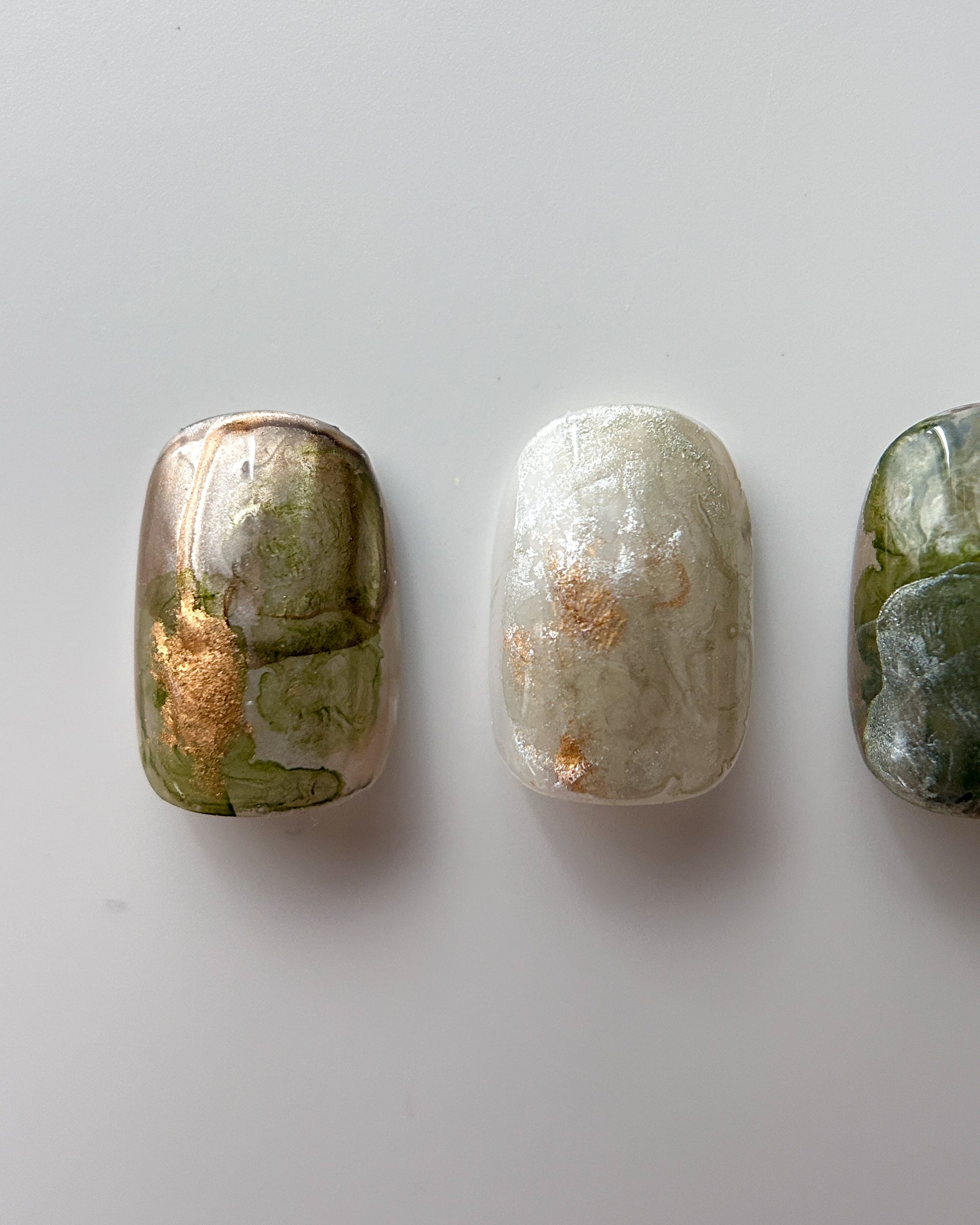深い緑、苔色、ベージュ、銀が境界なく溶け合い、